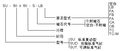80mm,附磁, 采用LB固定型式的标准复动型气缸,其正确的订购码代号为: SU-63 x 80-S-LB.